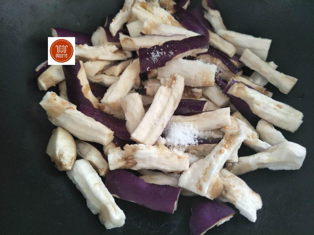 5、鍋中倒適量油,跟平時(shí)炒菜的油量一樣,油8成熱左右,將茄子條入鍋中,緊跟著撒鹽,讓茄子里的汁出來變軟。
