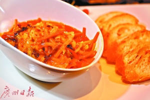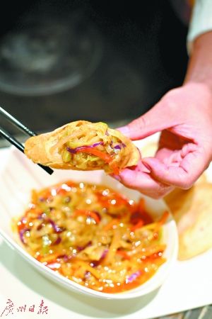 中餐行政總廚譚國(guó)輝卻認(rèn)為,咖喱的舞臺(tái)大得很,蔬菜在這個(gè)舞臺(tái)上也能找到自己的位置,比如椰菜、西芹、洋蔥、燈籠椒等,就連芥藍(lán)都可以。當(dāng)然,也有不那么合適,比如白蘿卜。他想出了一個(gè)適合夏天吃的咖喱雜菜配法包,融合了東南亞菜與西餐的元素。這道小菜既不肥膩又避免了多肉,適合keep fit的白領(lǐng)一族。今期,我們請(qǐng)譚師傅教大家做這一道簡(jiǎn)單易操作的夏日小菜。