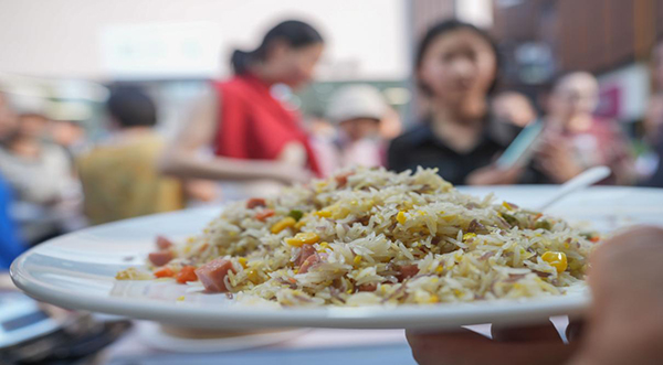 7月11日,山東省鄒平市舉行的第三屆齊魯小吃文化節(jié)暨黃河大集夏日消費(fèi)季活動現(xiàn)場的現(xiàn)場制作區(qū),日照市莒縣的五谷蛋炒飯吸引了游客和市民。