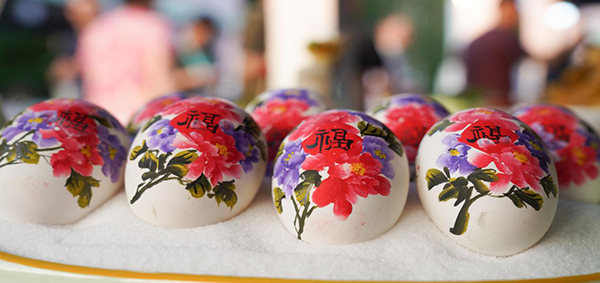 7月11日,在山東省鄒平市舉行的第三屆齊魯小吃文化節(jié)暨黃河大集夏日消費(fèi)季活動現(xiàn)場的地市宴席展區(qū),菏澤市曹縣的七彩蛋中牡丹美食吸引了眾多目光。