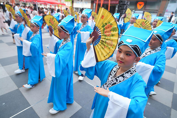 7月12日,山東省鄒平市舉行的第三屆齊魯小吃文化節(jié)暨黃河大集夏日消費(fèi)季活動現(xiàn)場,鄒平市的小呂劇愛好者為游客表演《姊妹易嫁》片段。