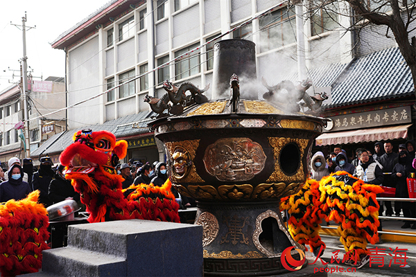 巨型暖鍋開鍋前舞獅表演助興。人民網(wǎng) 顧斐菲攝