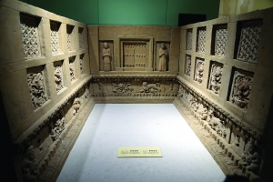 為了展示北方戲曲風(fēng)貌,南京博物院專門從山西博物院借展重要文物——金代整體墓室戲曲磚雕。這座墓室發(fā)掘于2009年,墓主人經(jīng)鑒定應(yīng)是金代比較富有的社會階層,墓室表現(xiàn)的是墓主人正觀看戲班的演出。