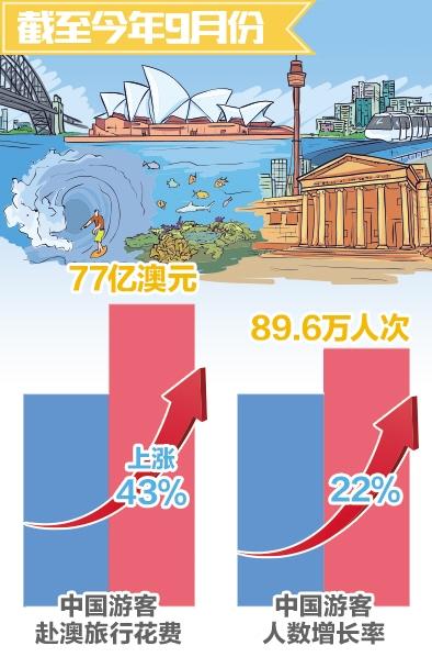 澳大利亞旅游研究機構公布的最新報告顯示,截至今年9月份,中國游客赴澳旅行時的航空、飲食及住宿花費上漲43%,達到創(chuàng)紀錄的77億澳元。同時,來自中國的游客人數(shù)也有較大幅度增長,增長率為22%,達到89.6萬人次。