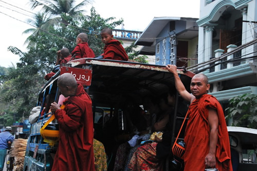 曼德勒市民很尊敬僧人,坐車不收他們的錢。和尚也很自覺,主動爬到車頂,不去占收費(fèi)的座位。