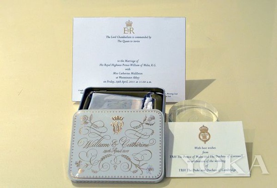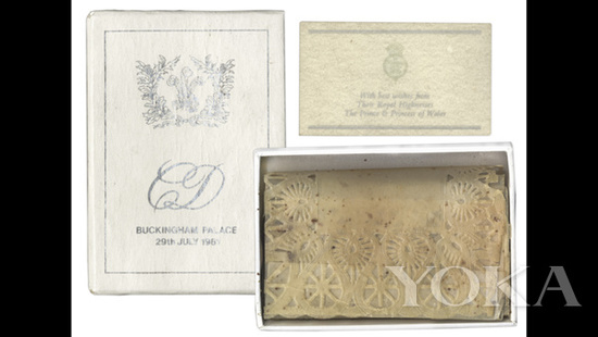 這塊蛋糕被包在一塊裝飾桌巾內(nèi),放置在原裝盒子里,盒子上寫著婚禮的時間和地點——1981年7月29日,白金漢宮。隨蛋糕還附有一張卡片,上面寫著:“來自威爾士王子與王妃殿下的最誠摯祝福”。
