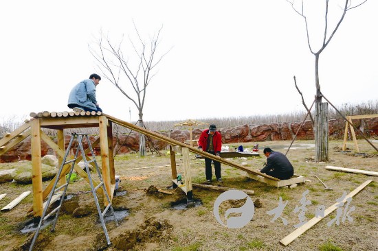 12月27日,大豐港區(qū)動物園內(nèi),工人在大熊貓館建造供熊貓娛樂的設(shè)施。此次為大熊貓卯卯、酉酉新增的娛樂設(shè)備有滑梯、梅花樁、秋千等。工程將在元旦前完工,屆時,大熊貓將萌度升級,為游客帶去更多歡笑。 胡金波 攝