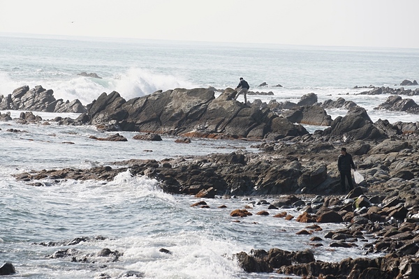 海灘礁石上有零星的幾個人,有的在釣魚,有的拿著塑料袋找什么,一定是趕海了。