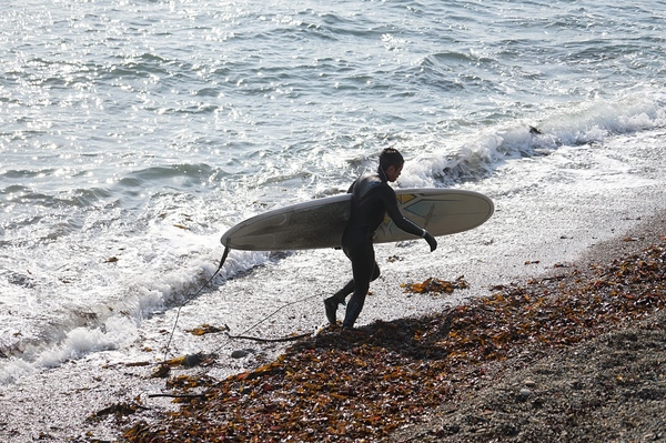 三月的日本還很寒冷,但有些沖浪愛好者已經(jīng)迫不及待下海了,當然他們穿了緊身衣。