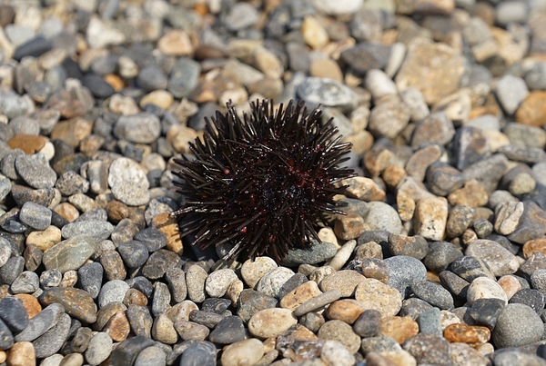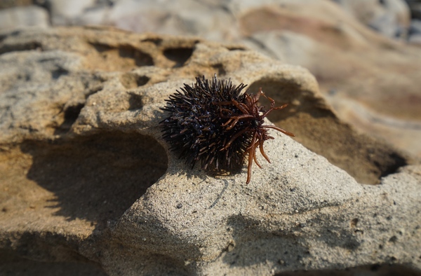 很快發(fā)現(xiàn)一個黑乎乎的東西,放到沙灘上還能動,是活的海膽。