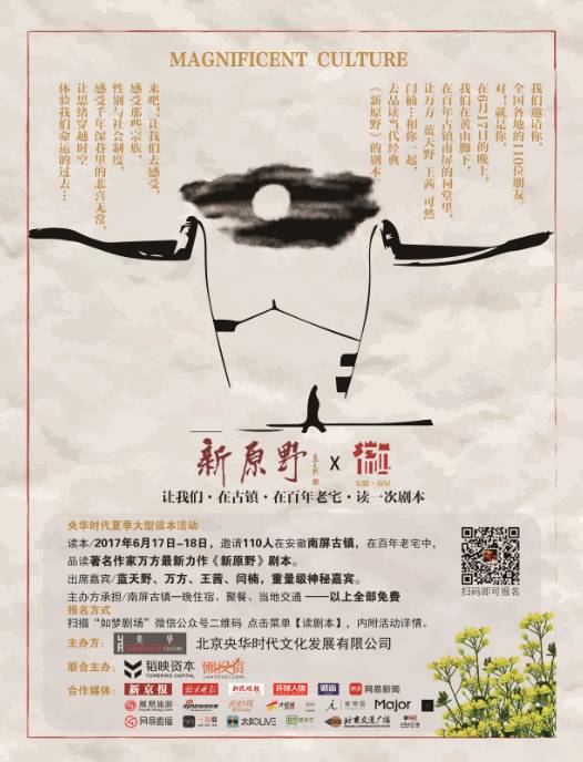 今年時(shí)逢“中國(guó)戲劇誕生110周年”,由北京央華時(shí)代主辦,韜映資本、懶投資聯(lián)合主辦的央華時(shí)代讀本會(huì)大型夏季主題活動(dòng)——在南屏古鎮(zhèn)品讀劇本《新原野》,將于6月17日至18日在安徽省黃山市的南屏古鎮(zhèn)舉行。