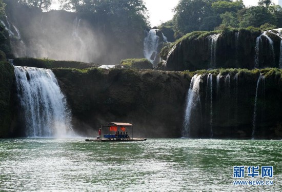 游客在廣西崇左市大新縣德天跨國瀑布景區(qū)乘坐竹筏游玩(5月3日攝)。地處中越邊境的廣西崇左市,所轄7個縣(市、區(qū))中有4個縣(市)與越南接壤,邊境線上擁有德天跨國瀑布、友誼關等豐富的旅游資源。隨著“一帶一路”建設不斷深入推進,當地中越跨境旅游合作區(qū)建設日益提速,中越跨境旅游長廊逐步成型。新華社記者 陸波岸 攝