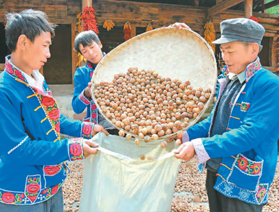 楚雄大力發(fā)展高原綠色農(nóng)業(yè)。圖為南華縣核桃豐收,村民樂了。