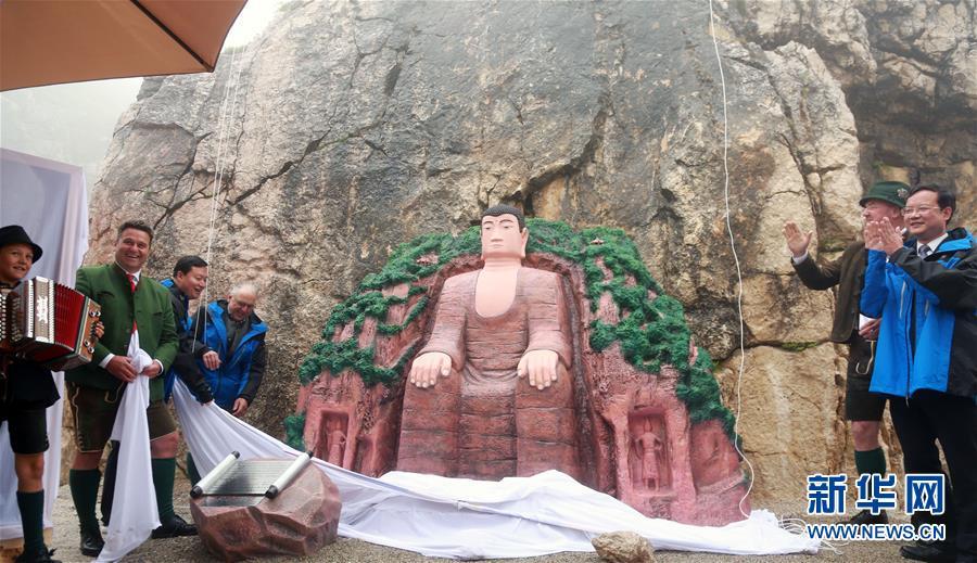 7月2日,在奧地利達赫施泰因山—薩爾茨卡默古特景區(qū),來自中國四川樂山市的代表團成員與奧地利旅游部門工作人員共同為微縮版樂山大佛佛像揭幕。