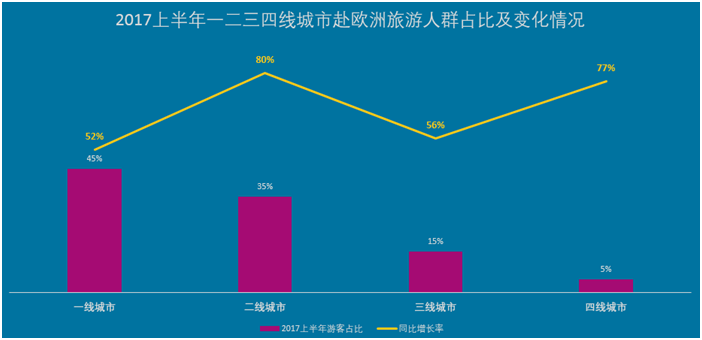哪些省市是歐洲游的生力軍?歐洲游市場(chǎng)從一線城市(北上廣深)向二三線城市滲透發(fā)展。今年上半年,二線、三線城市赴歐洲的游客總計(jì)占比達(dá)50%,超過(guò)一線城市。同時(shí)增速也高于一線城市,上半年二、三、四線城市實(shí)現(xiàn)了80%、56%、77%的同比增長(zhǎng)。二三線城市已成為攜程旅游、華遠(yuǎn)國(guó)旅等大型旅行社市場(chǎng)布局的新重點(diǎn)。