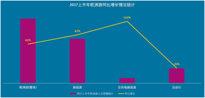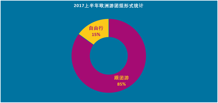 據(jù)攜程旅行網(wǎng)、華遠(yuǎn)國(guó)旅交易數(shù)據(jù)顯示,2017年上半年中國(guó)游客赴歐洲旅游人次同比增長(zhǎng)65%。其中跟團(tuán)游實(shí)現(xiàn)了81%的高增長(zhǎng),目的地跟團(tuán)游增長(zhǎng)翻番,增長(zhǎng)率達(dá)103%。跟團(tuán)游依然是歐洲游的主要方式,有85%的國(guó)人選擇了跟團(tuán)方式。盡管選擇自由行的中國(guó)游客占比僅為15%,但增長(zhǎng)速度較快,自由行游客規(guī)模同比增長(zhǎng)了26%。