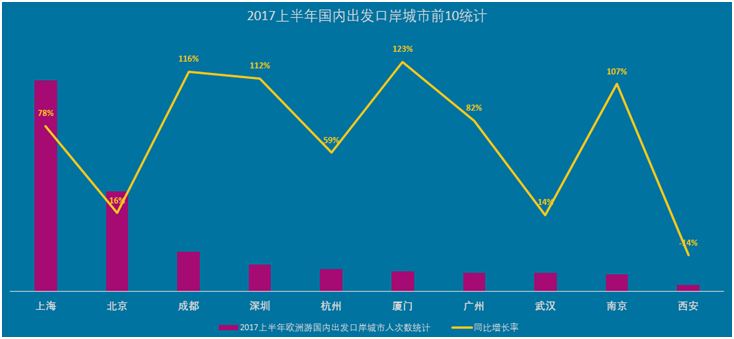 報(bào)告發(fā)布了上半年赴歐洲游出發(fā)口岸城市排行,上海、北京、成都、深圳、杭州、廈門、廣州、武漢、南京、西安位列前十。赴歐洲游客依然集中于北京、上海兩大口岸城市出發(fā),但成都、廈門、南京等其他口岸城市顯示出巨大的增長(zhǎng)潛力。