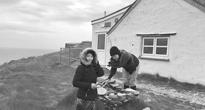 兩名中國(guó)游客在位于英國(guó)康沃爾海濱懸崖上的一家民宿院子里燒烤。林衛(wèi)光攝