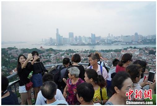 9月6日,廈門鼓浪嶼日光巖游人如織,許多游客在這里俯瞰鼓浪嶼美景并合影留念。 中新社記者 毛建軍 攝