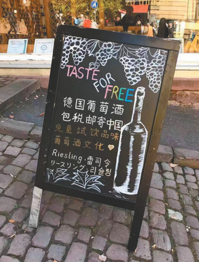 德國法蘭克福,當(dāng)?shù)仄咸丫粕掏瞥隽酥形膹V告牌。