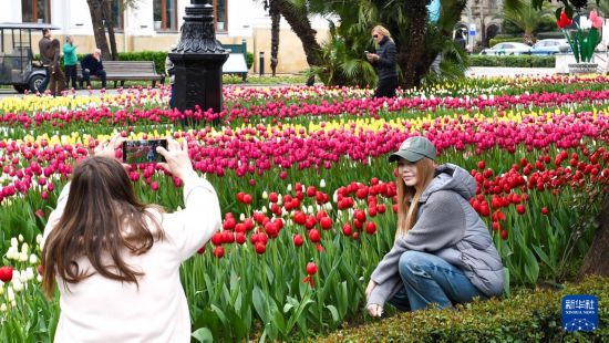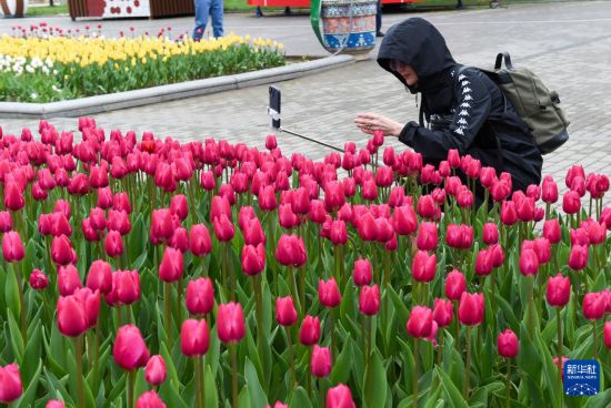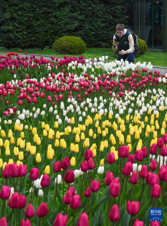 近日,位于阿塞拜疆首都巴庫的海濱公園春意盎然,郁金香競相綻放,吸引游客駐足欣賞、拍照留念。