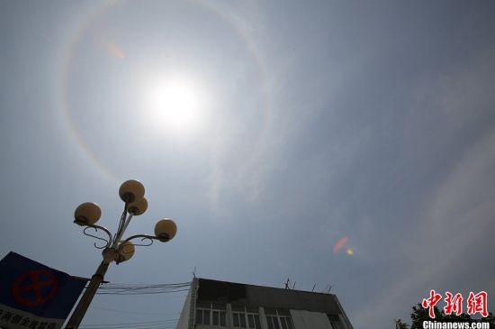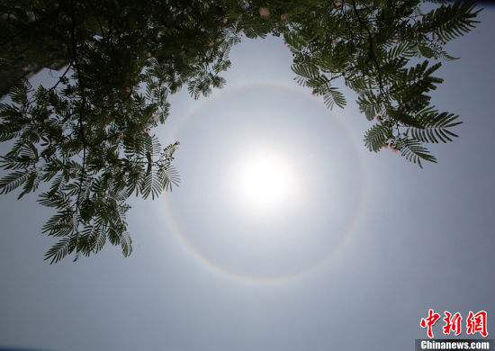 6月3日上午11點(diǎn)20分,安徽省宿州市上空出現(xiàn)“日暈”奇觀,太陽四周有一個(gè)巨大的彩虹圈,引來不少市民駐足觀看。日暈是一種大氣光學(xué)現(xiàn)象,多出現(xiàn)在春夏季節(jié)。民間有“日暈三更雨,月暈午時(shí)風(fēng)”的諺語。中新社發(fā)馬勇 攝 圖片來源:CNSPHOTO