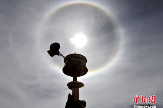 9月2日,拉薩上空出現(xiàn)日暈奇觀。日暈是一種大氣光學(xué)現(xiàn)象,是日光通過卷層云時(shí),受到冰晶的折射或反射而形成的。圖為信教群眾手中的轉(zhuǎn)經(jīng)筒與天空中出現(xiàn)的日暈相映成趣。中新社發(fā)李林 攝