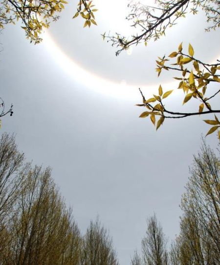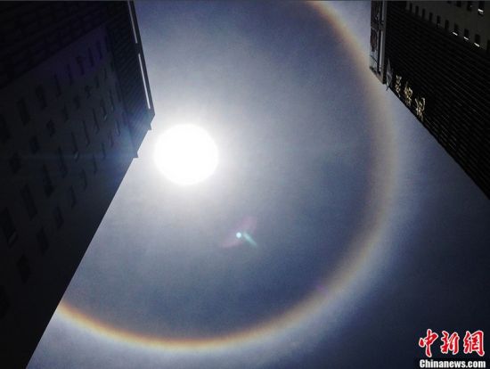 3月25日正午,昆明上空出現(xiàn)罕見的日暈景象。據(jù)了解,日暈是一種罕見的大氣光學(xué)現(xiàn)象,是日光通過卷層云時(shí),受到冰晶的折射或反射而形成的。民間認(rèn)為,出現(xiàn)日暈天氣有可能轉(zhuǎn)陰或下雨。任東攝