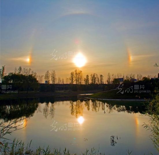2012年12月10日早晨8時(shí)左右,江蘇省太倉市天空出現(xiàn)令人稱奇的“日暈”天象,天空中仿佛出現(xiàn)三個(gè)太陽,包圍太陽的圓環(huán)出現(xiàn)紅黃綠等多種顏色,宛如一道彩虹。氣象專家介紹說,這是“日暈”奇觀,很常見的一種現(xiàn)象。它形成的原因是高空中出現(xiàn)了由冰晶構(gòu)成的卷層云。卷層云中的冰晶經(jīng)過太陽照射后會(huì)發(fā)生折射和反射等物理變化,陽光便分解成了紅、黃、綠、紫等多種顏色,這樣往往在太陽周圍出現(xiàn)一個(gè)或兩個(gè)以上以太陽為中心、內(nèi)紅外紫的彩色光環(huán),有時(shí)還會(huì)出現(xiàn)很多彩色或白色的光點(diǎn)和光弧,這些光環(huán)、光點(diǎn)和光弧統(tǒng)稱為暈,日暈是一種大氣光學(xué)現(xiàn)象。由太陽照射冰晶反射至人類眼睛稱為"日暈",而月球照射冰晶反射至人類眼睛則稱為"月暈"! (計(jì)海新)