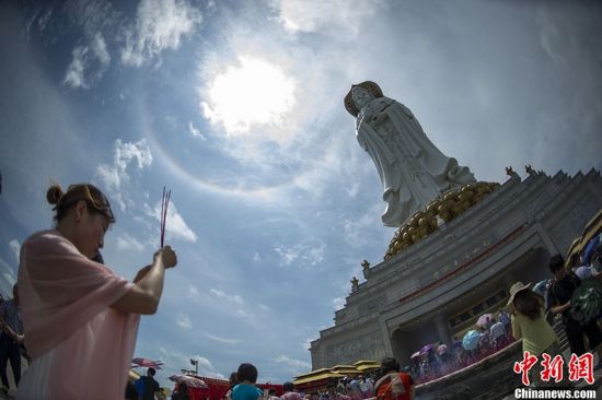 4月29日,海南三亞上空出現(xiàn)罕見的日暈奇觀,在三亞南山景區(qū)108米海上觀音像前,不少游客駐足觀看這一奇景。中新社發(fā) 駱云飛攝