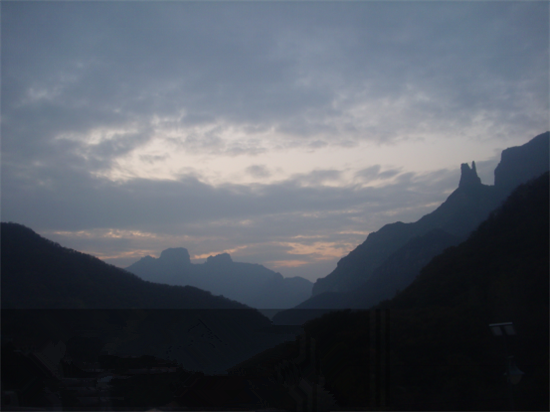 早晨,太陽還未升起。遠山的暮褐還未退去.......