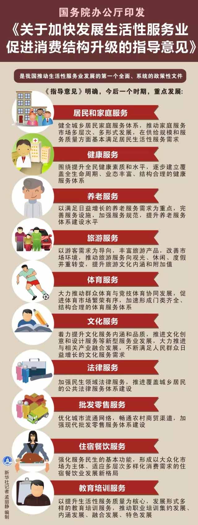 近日,國務(wù)院辦公廳印發(fā)《關(guān)于加快發(fā)展生活性服務(wù)業(yè)促進(jìn)消費(fèi)結(jié)構(gòu)升級(jí)的指導(dǎo)意見》(以下簡稱《指導(dǎo)意見》),這是我國推動(dòng)生活性服務(wù)業(yè)發(fā)展的第一個(gè)全面、系統(tǒng)的政策性文件,是適應(yīng)人民群眾消費(fèi)升級(jí)需求、推動(dòng)生活性服務(wù)業(yè)全面提升規(guī)模、品質(zhì)和效益的總體部署。