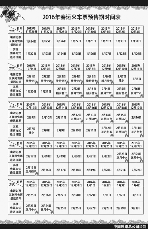 本報北京11月24日電 (記者陸婭楠)記者24日從中國鐵路總公司獲悉:2016年春運火車票11月26日開售。互聯(lián)網(wǎng)、手機客戶端、電話等三種渠道的預(yù)售期為60天;車站窗口、代售點、自動售票機等渠道的預(yù)售期為58天;春運增開旅客列車的火車票自12月16日起開始發(fā)售,預(yù)售期為40天。2016年春運每天安排開行旅客列車3488對,比2015年春運增長14.5%。