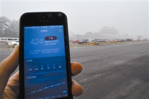 11月30日下午兩點(diǎn)半左右,一款氣象類的APP顯示北京東城區(qū)空氣質(zhì)量為嚴(yán)重污染。