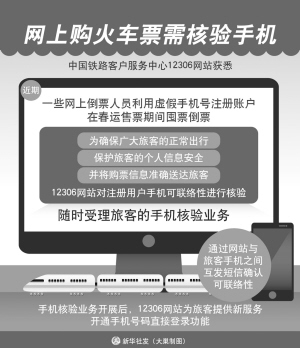 據(jù)了解,為防止旅客身份信息被搶注,鐵路12306網(wǎng)站11月初推出了手機(jī)雙向驗(yàn)證服務(wù),旅客在登錄12306網(wǎng)站注冊(cè)時(shí),頁(yè)面提示需進(jìn)行手機(jī)雙向驗(yàn)證。旅客需使用注冊(cè)時(shí)留的手機(jī)號(hào),向12306發(fā)送短信“999”。然后,12306會(huì)回復(fù)一個(gè)6位數(shù)字的短信到該手機(jī)上。新用戶需在10分鐘之內(nèi),輸入這6位數(shù)字的驗(yàn)證碼,從而登錄12306網(wǎng)站。同時(shí),雙向驗(yàn)證后旅客即使忘記自己的用戶名,也可以用手機(jī)號(hào)直接登錄12306網(wǎng)站或12306手機(jī)客戶端購(gòu)票。