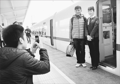 圖為旅客與乘務(wù)員在車(chē)門(mén)前合影。 |