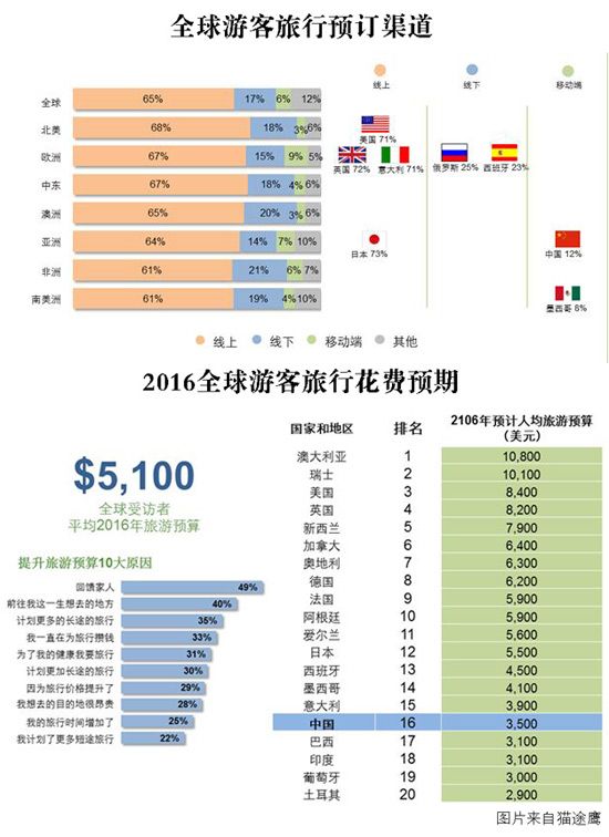 從全球范圍內(nèi)來(lái)看,年齡段在65歲以上的老年受訪者的旅游年預(yù)算最為充足,平均每人達(dá)到8736美元,而18~34歲受訪者相對(duì)保守,人均旅行預(yù)算為2915美元;從國(guó)家范圍來(lái)看,澳大利亞受訪者的年均旅游預(yù)算額度最高,達(dá)10800美元,中國(guó)受訪者2016年的旅行預(yù)算在全球范圍內(nèi)排名第16,平均為3500美元(約22800元人民幣),低于全球平均水平(5100美元)。此外,49%的全球受訪者表示計(jì)劃增加旅行預(yù)算的原因是為了回饋?zhàn)约汉图胰,而中?guó)受訪者的這一比例是61%。