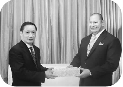 國家旅游局局長李金早(左)作為國家主席習(xí)近平特使,會見湯加國王圖普六世。