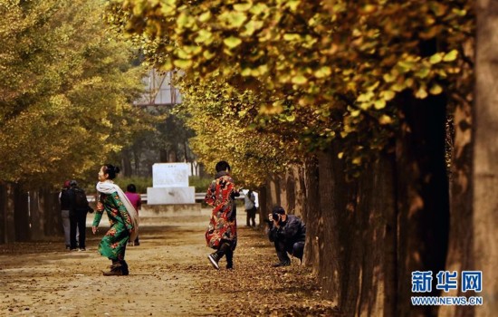 10月13日,市民在銀杏林中賞秋留影。深秋時(shí)節(jié),北京市昌平區(qū)張各莊村銀杏綠化種植園內(nèi)的銀杏樹林一片金黃,美如畫卷,吸引大批市民前來觀賞秋景。 新華社記者 李欣 攝