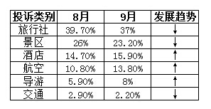 據(jù)平臺統(tǒng)計,9月涉及旅行社的投訴最多,占比為37%,其次為景區(qū)投訴(23.2%)、酒店投訴(15.9%)、航空投訴(13.8%)、導(dǎo)游投訴(8%)和交通投訴(2.2%)。涉及旅行社、景區(qū)和交通的投訴與八月相比略有下降,涉及酒店、航空和導(dǎo)游的投訴較上月略有上漲。網(wǎng)友的投訴主要提及了旅游遇到導(dǎo)游誘導(dǎo)購物、不退貨不退款、酒店實際情況與訂單不符等問題。