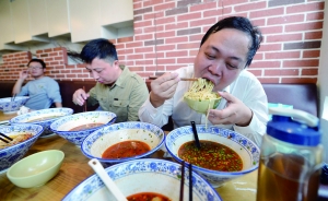“人多,在一起吃飯,飯量就會增大。我也要挑戰(zhàn)第四碗。”41歲的張先生吃完第三碗面,緊跟著老徐要了第四碗。“感覺胃已經(jīng)撐了,但看大家熱情高漲,我還能塞一點進去。”