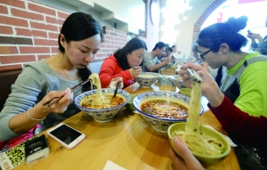 9月中旬,現(xiàn)代快報主辦的“2016南京面條大會”盛大開幕。作為“面條大會”的后續(xù)活動之一,10月21日,快報在專做陜西面的西客面館舉辦了一場“大胃王挑戰(zhàn)賽”。一碗岐山臊子面大約4兩面,“女子組冠軍”吃光了兩碗,而獲得“大胃王”稱號的48歲徐師傅,一口氣吃完了5碗面,獲得店家提供的500元“土豪面券”。