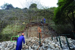 南京明城墻小桃園段局部坍塌,工作人員正在搭腳手架準備維修