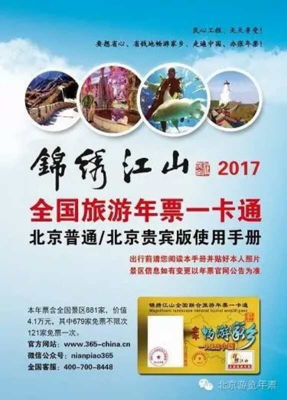 2017錦繡江山全國旅游年票今起在北京發(fā)售。僅需98元,可暢游北京太平洋海底世界、十三陵、八達嶺水關(guān)長城、濟南大明湖、河南萬仙山、承德金山嶺長城、黃山西遞、蘇州木瀆古鎮(zhèn)等881家5A、4A旅游景區(qū)、森林公園、文化遺址和博物館,其中800家門票全免,免票價值4.1萬元且不限使用次數(shù)。