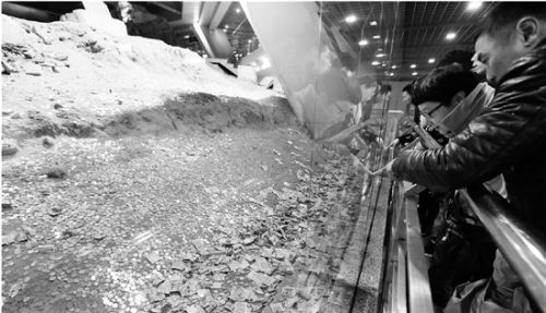 剛走進(jìn)展示區(qū),就看見一位五六十歲的阿姨拿著硬幣在做投擲動(dòng)作,阿姨還用了點(diǎn)力氣,扔得蠻遠(yuǎn),扔完一個(gè)又準(zhǔn)備再扔一個(gè)。“哎哎,這里不好扔錢進(jìn)去的。”巡查的保安過(guò)來(lái)阻止。阿姨聽了只好作罷,和其他人一起往樓上走去。記者追上去問(wèn)了問(wèn),阿姨和朋友們來(lái)自黑龍江,她有點(diǎn)不好意思地說(shuō),看里面都是錢,自己也就想扔兩個(gè)進(jìn)去。