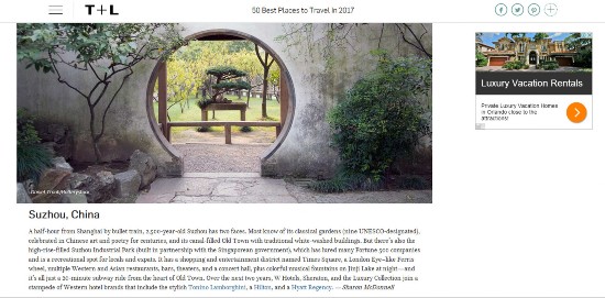 近日,國際知名高端旅游雜志《TRAVEL+LEISURE》發(fā)布“2017年50個最佳旅游目的地”,我省蘇州市成為中國唯一入榜目的地。