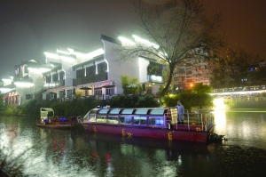 記者發(fā)現(xiàn),秦淮區(qū)西五華里一帶在緊鑼密鼓地提檔升級。首先是對河水進行清淤工程,如內(nèi)秦淮河東段從逸仙橋至東水關(guān),全長2.2公里,連接夫子廟段,這一段是內(nèi)秦淮河的重要組成部分,已經(jīng)完成了清淤工作。繼續(xù)往西,西五華里的亮化和景觀改造還在繼續(xù)進行,為觀光艇夜航做準備。同時,西五華里沿線設置了不少碼頭,如中華門碼頭、古戲苑碼頭和孫楚酒樓碼頭等。