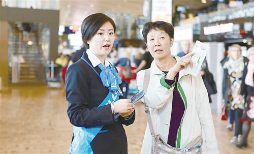 從2016年夏天開(kāi)始,赫爾辛基機(jī)場(chǎng)陸續(xù)推出一系列針對(duì)中國(guó)游客的服務(wù)項(xiàng)目。圖為在芬蘭赫爾辛基機(jī)場(chǎng),一名中文向?qū)橹袊?guó)旅客解答疑問(wèn)。 (新華社發(fā))