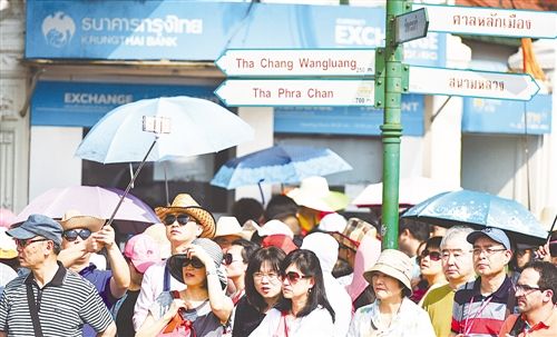 中國(guó)已是目前泰國(guó)旅游業(yè)最大的市場(chǎng),且還在不斷增長(zhǎng)。圖為在泰國(guó)曼谷,游客在大皇宮附近的一個(gè)路口等候(2016年2月11日攝)。