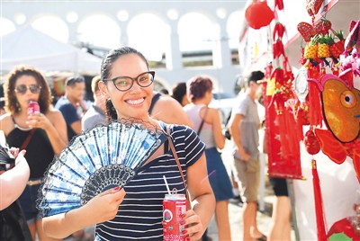 1月28日,“歡樂春節(jié)”系列活動(dòng)在巴西里約熱內(nèi)盧市拉帕景區(qū)繼續(xù)進(jìn)行。拉帕廣場(chǎng)上擺起中國(guó)小吃、書法等攤位,儼然一場(chǎng)“中國(guó)廟會(huì)”,吸引了不少里約當(dāng)?shù)厝饲皝砀惺苤袊?guó)文化。圖為一名巴西人在拉帕景區(qū)展示剛剛購買的扇子。